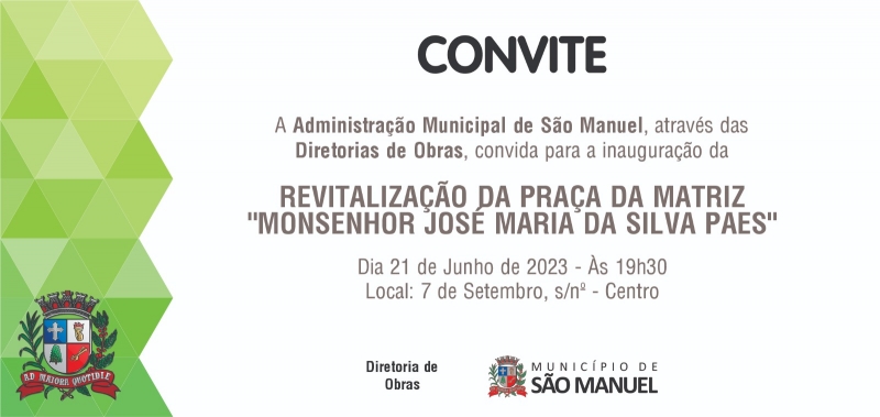 A Administração Municipal de São Manuel CONVIDA a população para a inauguração da REVITALIZAÇÃO DA PRAÇA DA MATRIZ "MONSENHOR JOSÉ MARIA DA SILVA PAES" que acontecerá na data de hoje, dia 21, às 19h30.