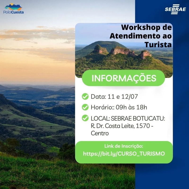 Nos dias 11 e 12 de julho, das 09h00 às 18h00, o SEBRAE, o Consórcio Polo Cuesta e a FIA-USP irão realizar um Workshop de Atendimento ao Turista, uma oportunidade imperdível para que os integrantes do nosso trade turístico possam aperfeiçoar seu atendimento e melhorar ainda mais a satisfação de seus clientes.