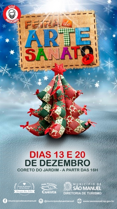 A Diretoria Municipal de turismo, juntamente com o Grupo de Artesãos Amigos das Artes, irá promover no mês de Dezembro sua tradicional feira de artesanato. Nos próximos dias 13 e 20 de Dezembro, a partir da 16 horas, no Coreto do Jardim Municipal, os munícipes podem conferir e adquirir diversos produtos produzidos de forma artesanal pelos nossos conterrâneos.
